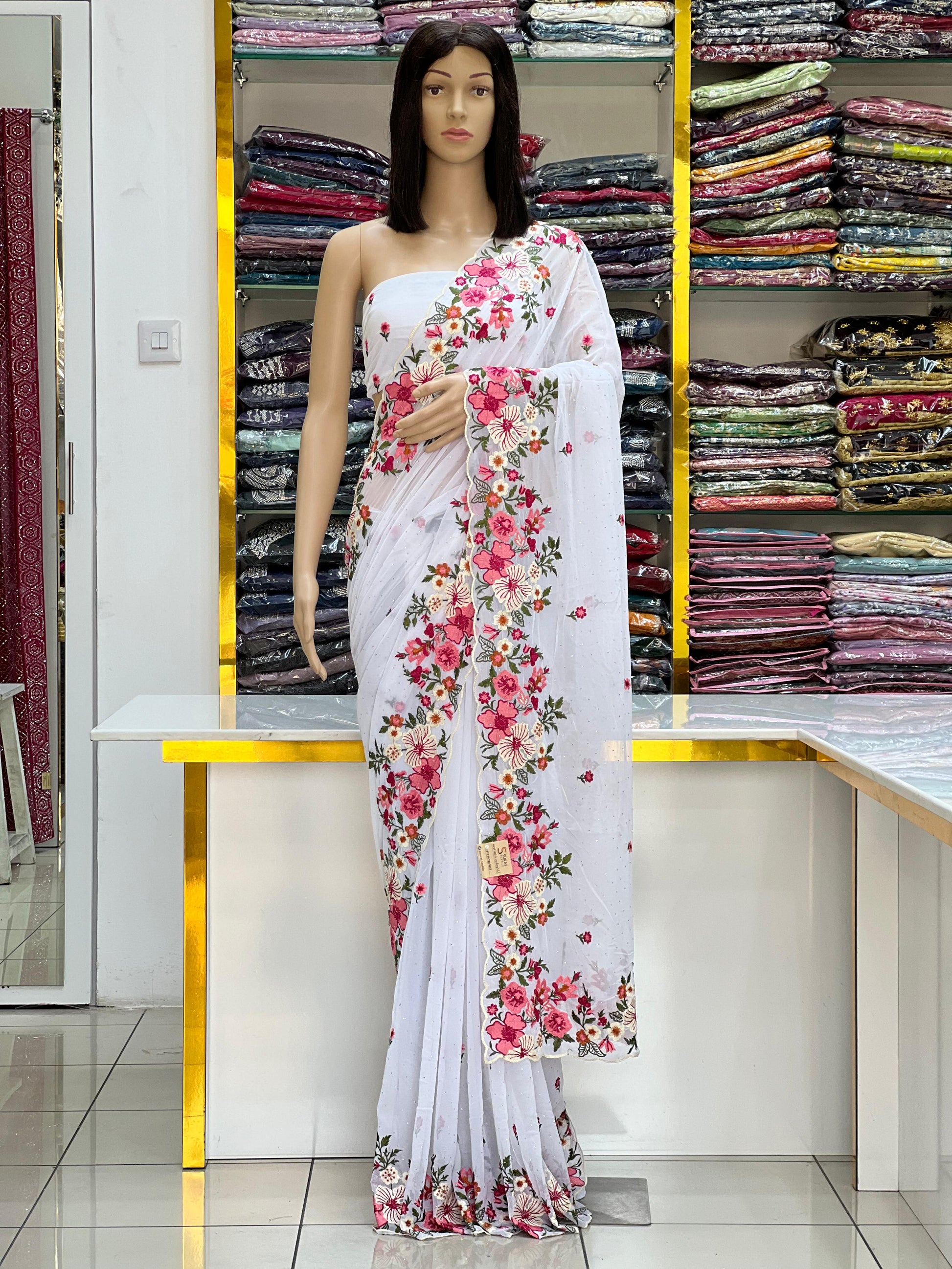 This gorgeous black georgette saree** features rich multi-color floral embroidery beautifully crafted along the border and pallu. The saree is enhanced with delicate swarosvki dot work, giving it a luxurious shine and a perfect party-wear finish.