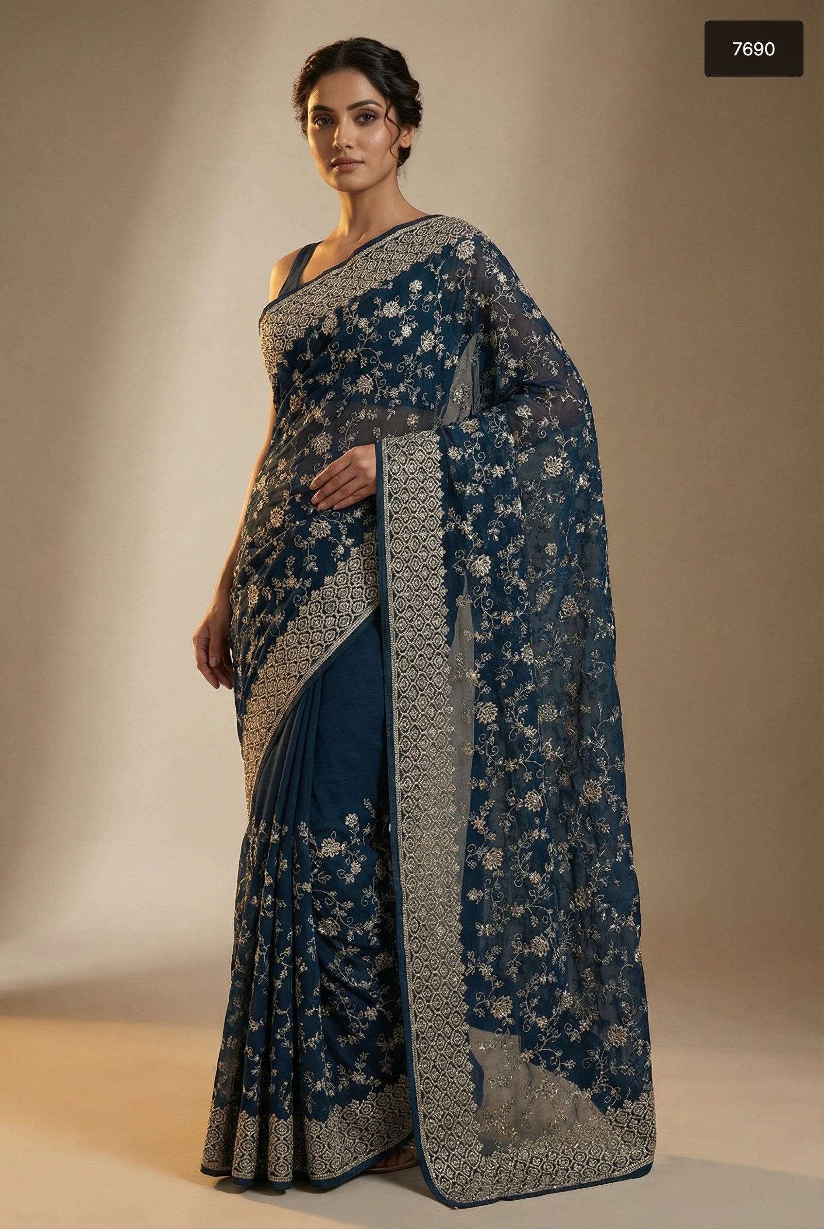Traditional Craftsmanship: Showcases the exquisite art of Indian handloom weaving and Zari embroidery.