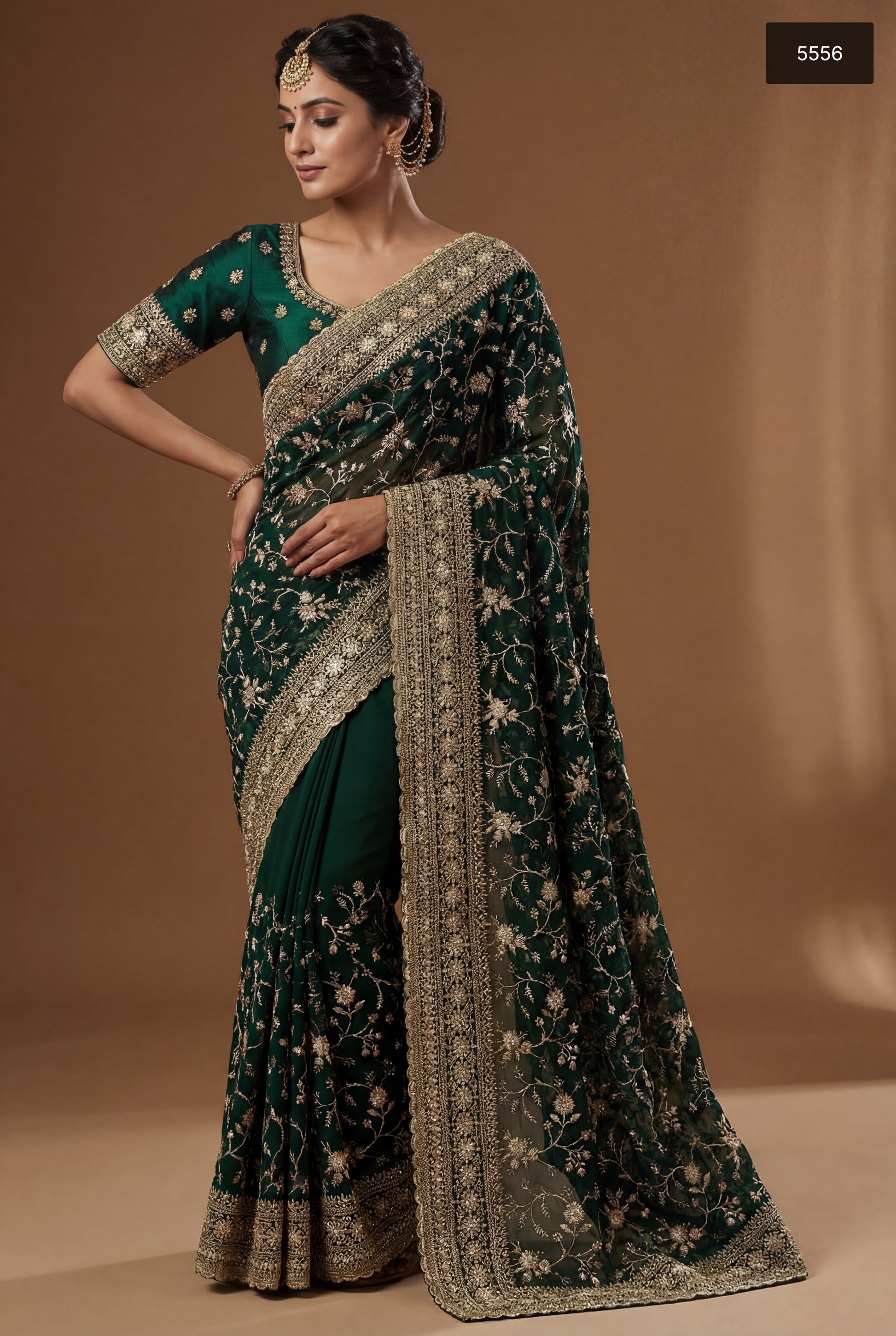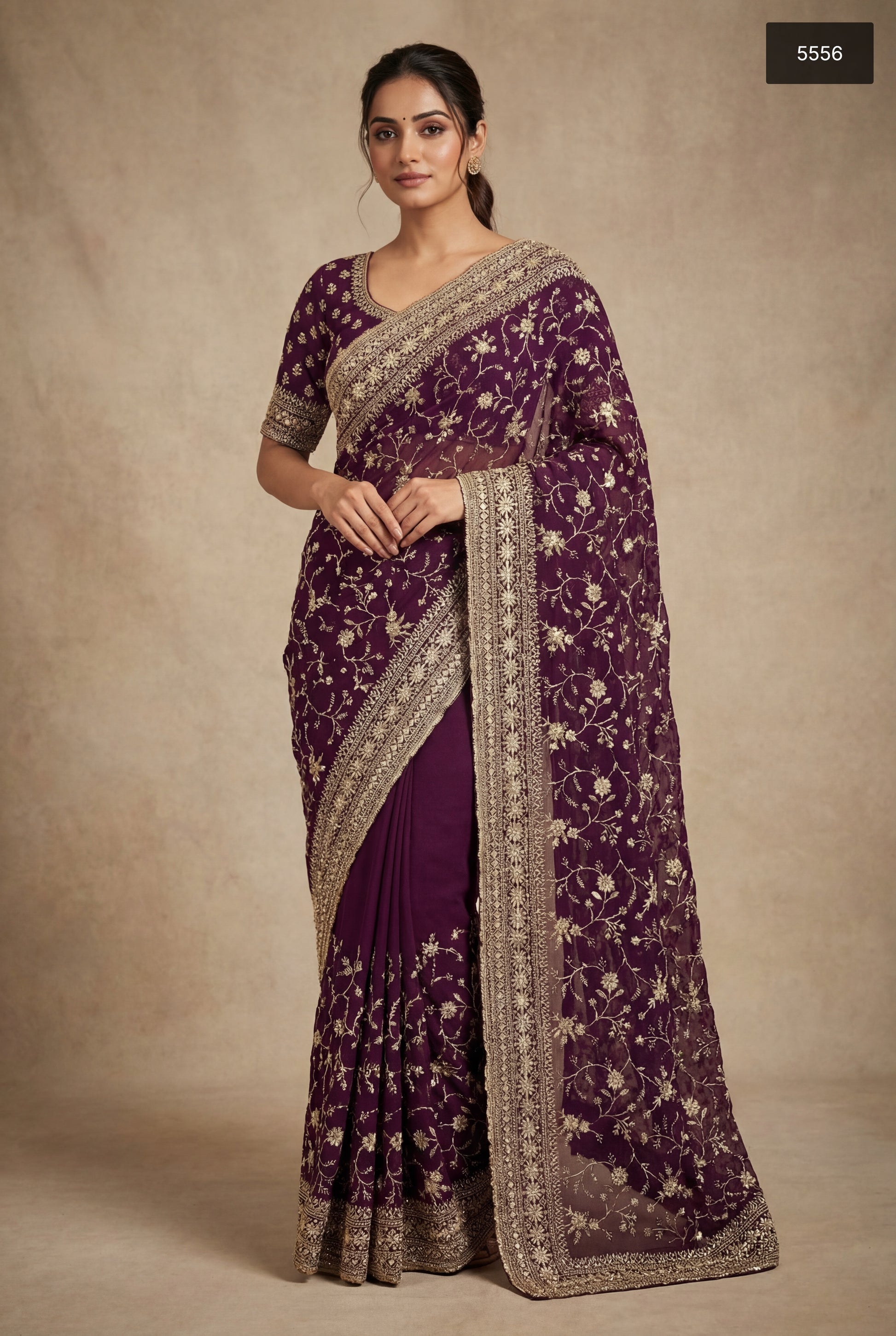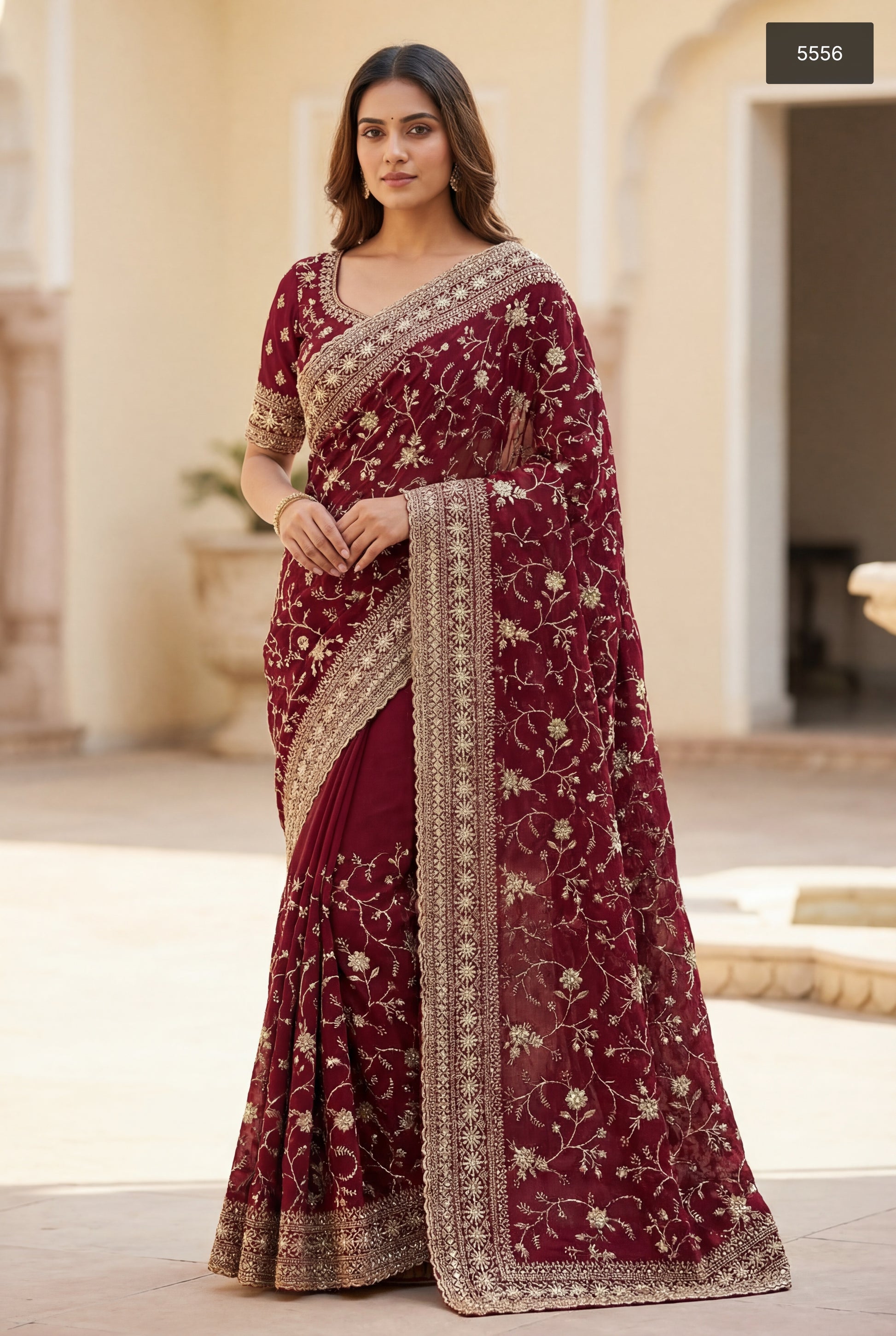 Indulge in the regal elegance of our meticulously crafted Georgette Saree Collection, featuring intricate Heavy Zari & Thread Embroidered Work that captures the light with every movement. This collection is a celebration of traditional artistry and modern sophistication, perfect for weddings, festive occasions, and grand celebrations.