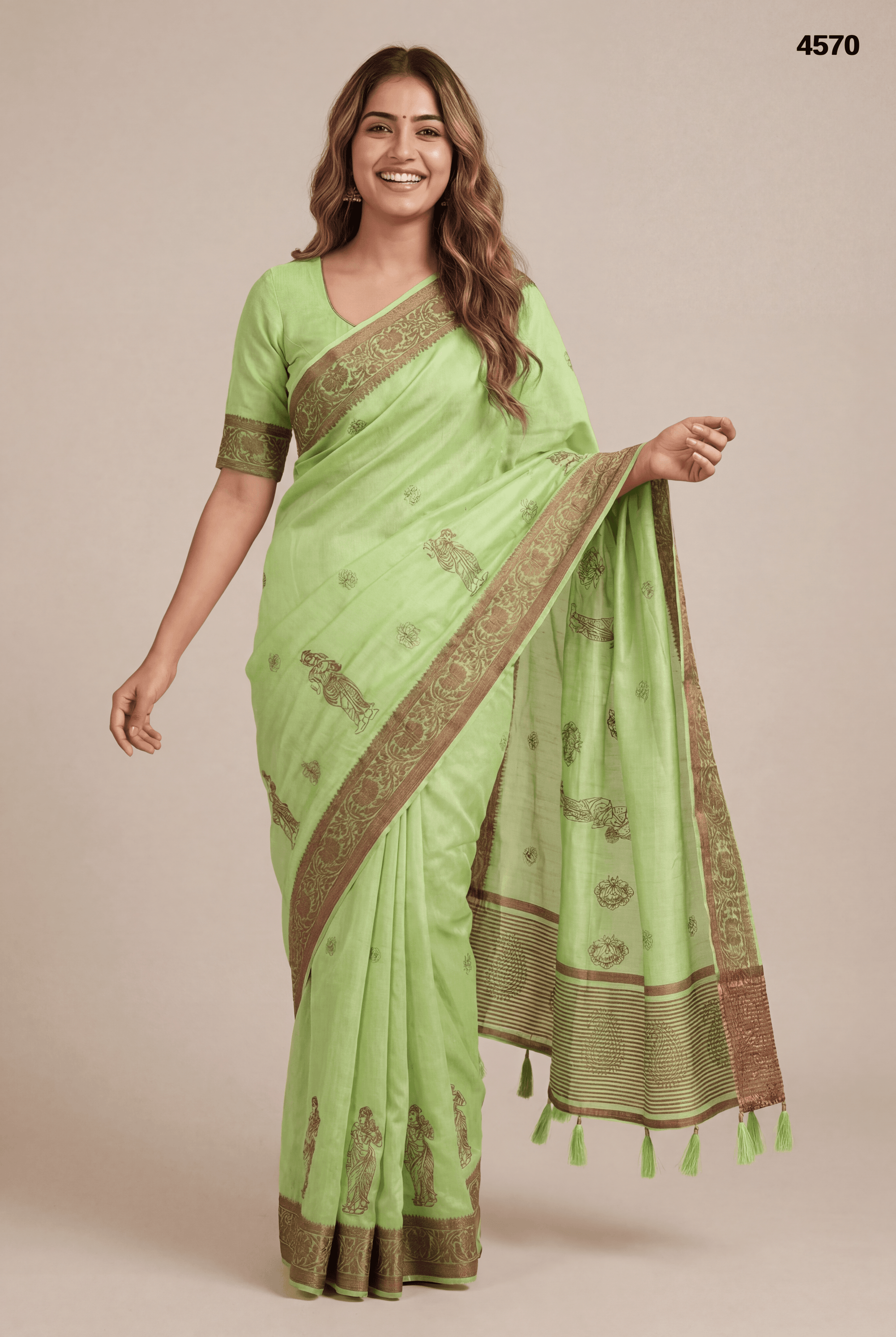 Presenting an elegant Cotton Silk Saree from SITARAM SAREES, manufactured in Surat and crafted for comfort, durability, and timeless appeal. This saree features a soothing light green base enhanced with traditional woven motifs across the body and a richly detailed contrast border, giving it a refined ethnic look suitable for daily wear as well as semi-festive occasions.
