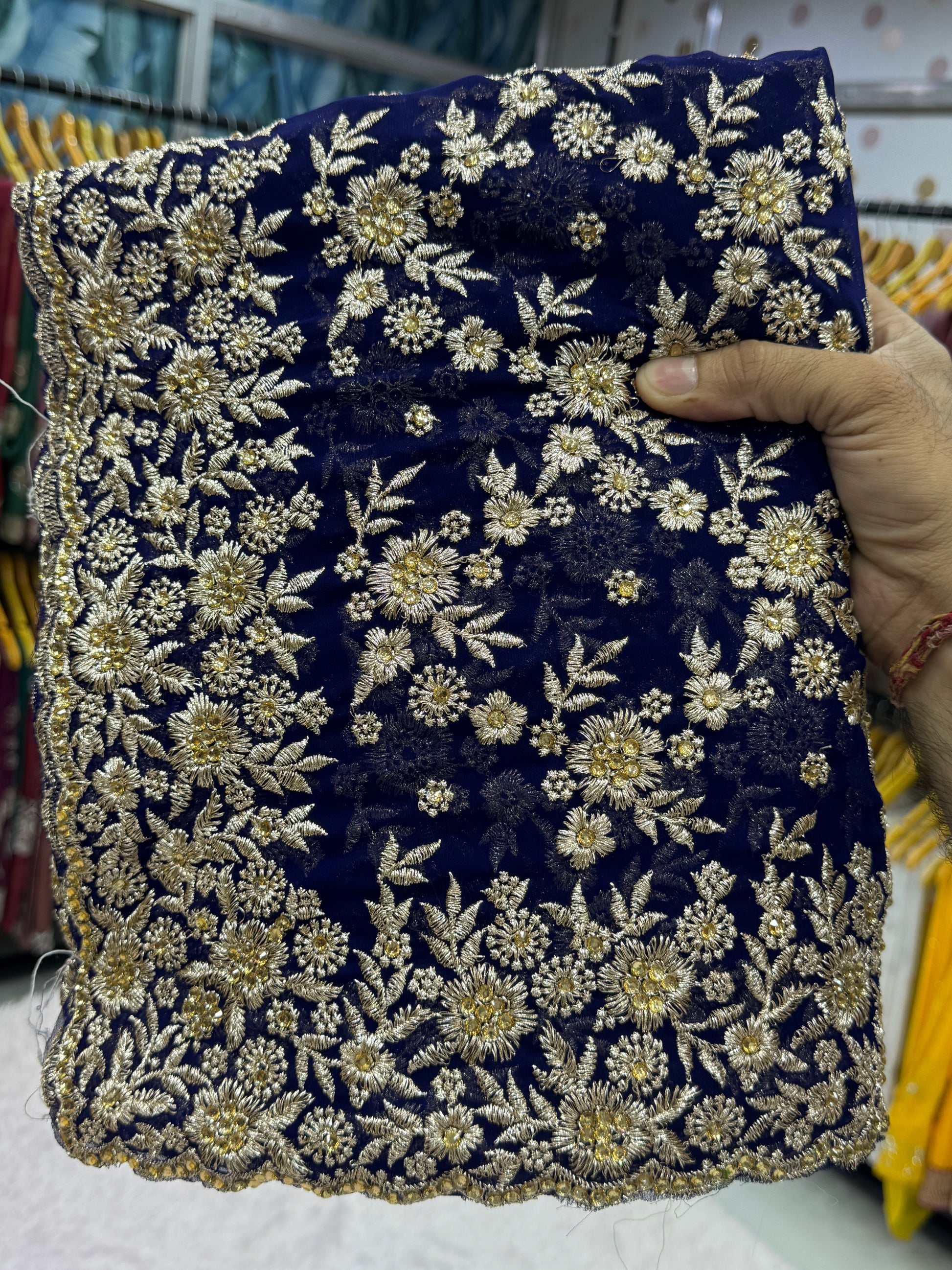 Upgrade your festive and bridal collection with this luxurious Royal Blue Designer Saree, crafted for grand occasions and premium customers. The rich blue base beautifully complements the intricate golden zari embroidery, making it a perfect choice for weddings, receptions, and high-end festive wear.