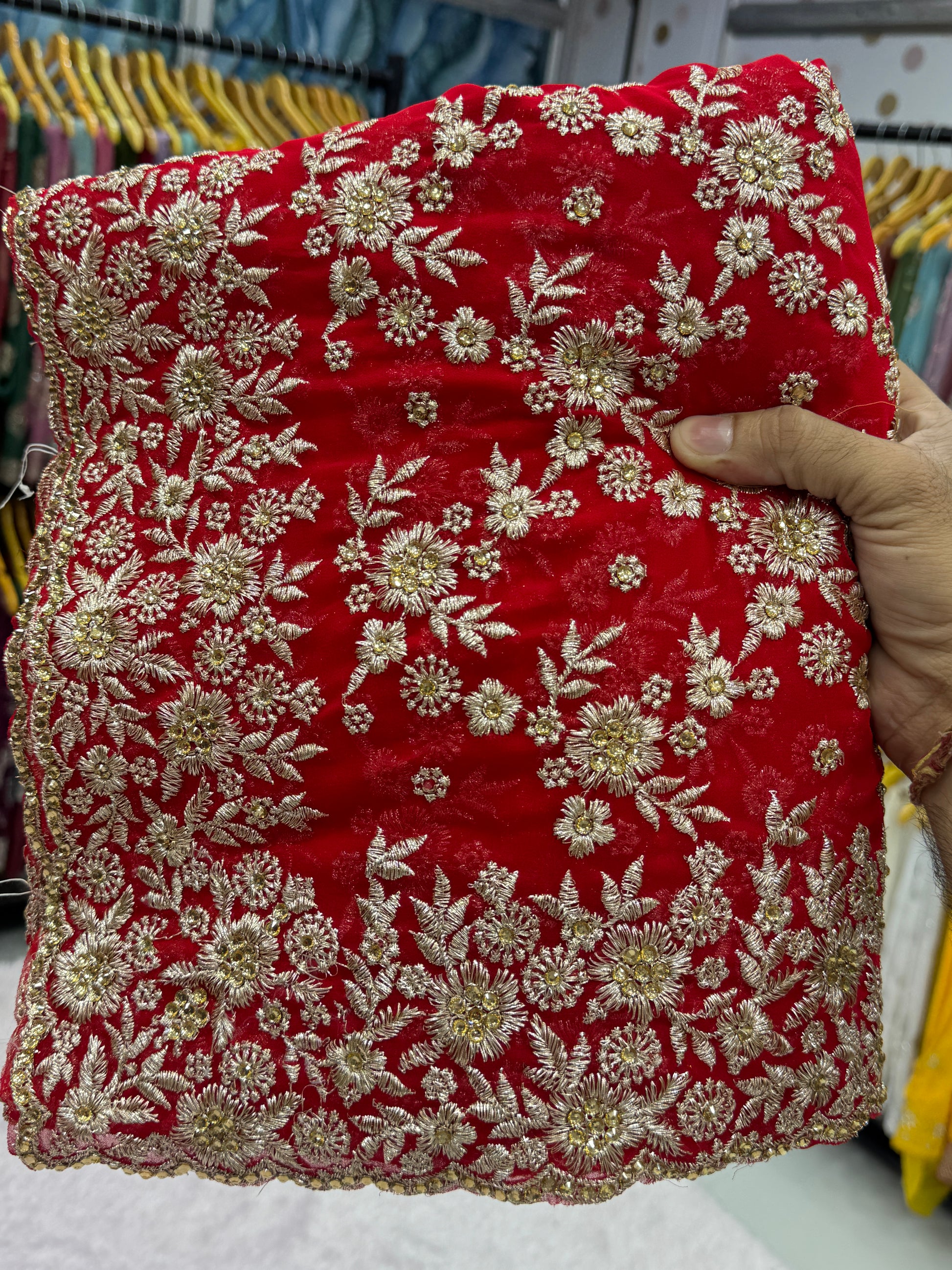 This stunning red saree features all-over fine zari embroidery work with a heavily designed border and pallu. The detailed floral motifs enhance the richness of the fabric, giving it a royal and elegant appearance. The graceful fall and premium finishing make it ideal for boutique collections and bridal segments.